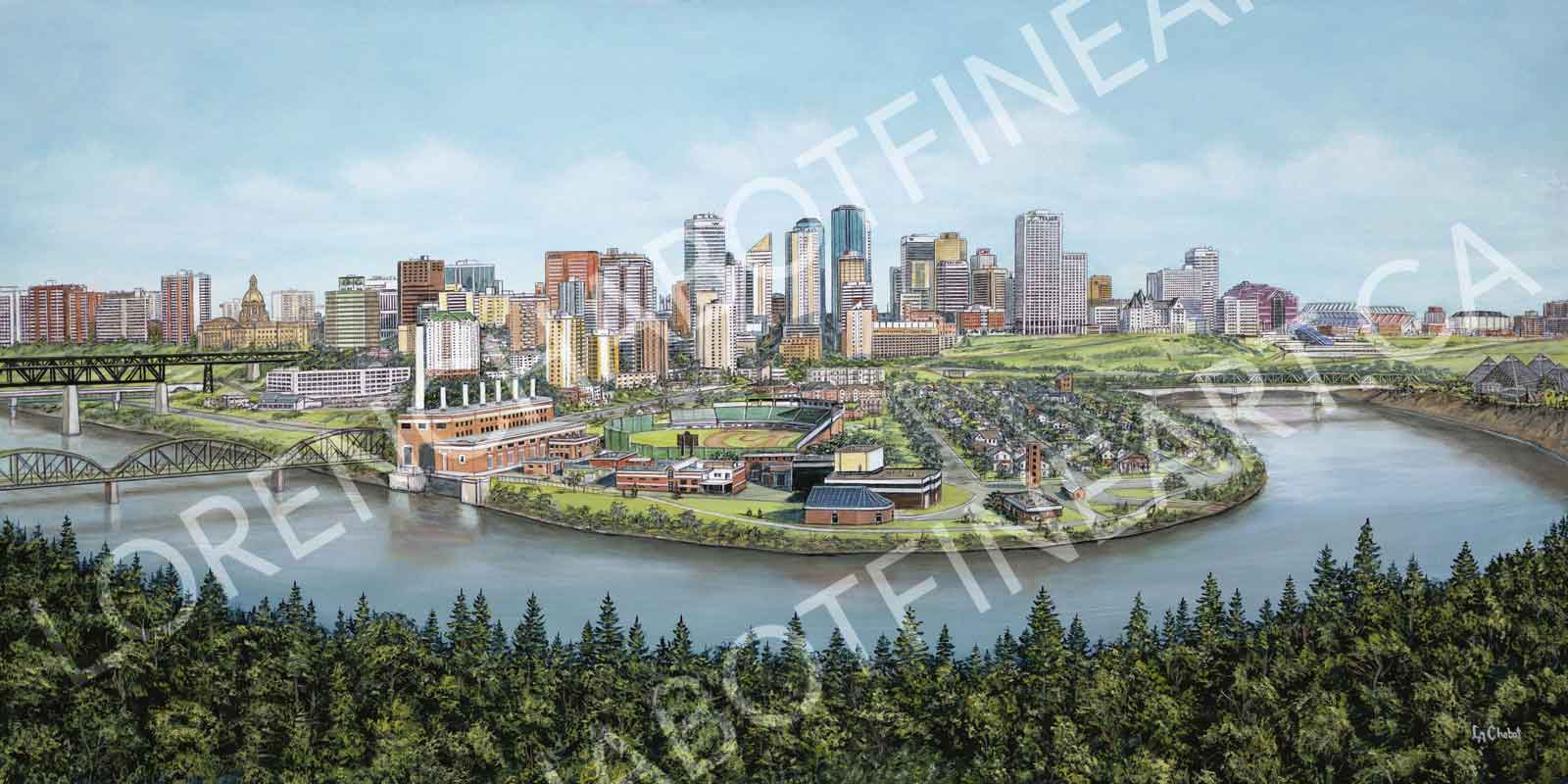 Rossdale Edmonton Skyline painting is done from Saskatchewan Drive and shows the deep bend in the North Saskatchewan River. In the foreground you can see Rossdale and the baseball diamond.